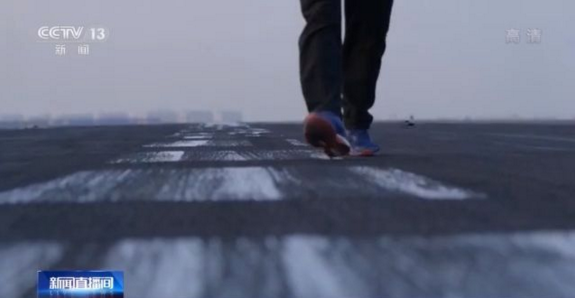 總臺(tái)央視記者李寧:這個(gè)就是在陸地上來(lái)模擬航母艦載機(jī)著陸的平臺(tái)。我們?cè)谶@個(gè)地方呆了兩天,直到今天日落黃昏,才終于有機(jī)會(huì)走上這個(gè)平臺(tái)。因?yàn)樗炤d機(jī)訓(xùn)練的頻次非常頻繁,我們只有在訓(xùn)練的間歇,才有機(jī)會(huì)帶大家來(lái)看一下。這里都是黑黢黢的一片,所以這個(gè)地方就叫做黑區(qū)。這一道道胎印就見證著這支艦載機(jī)部隊(duì)從無(wú)到有,一步步成長(zhǎng)的過(guò)程。