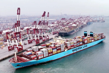▲在山東港口青島港前灣碼頭,歐洲貿(mào)易航線的“美途馬士基”集裝箱貨輪解纜起航(2022年7月29日攝,無(wú)人機(jī)照片)。新華社記者 李紫恒 攝