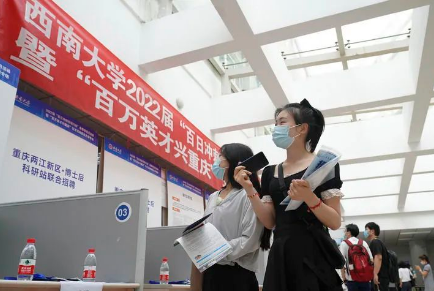 圖片▲在位于重慶市北碚區(qū)的西南大學(xué),應(yīng)屆畢業(yè)生參加“百萬(wàn)英才興重慶”招聘會(huì)(2022年5月13日攝)。用人單位提供了涉及教育、人工智能、汽車(chē)制造等領(lǐng)域的3000多個(gè)崗位供畢業(yè)生選擇。新華社發(fā)(秦廷富 攝)