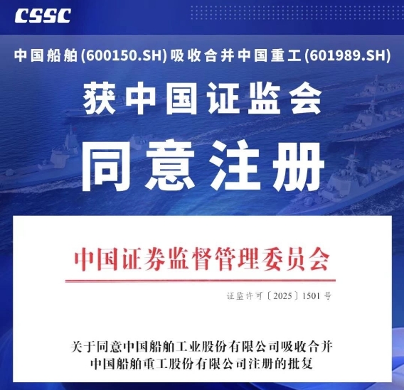7月18日,中國證監會發布《關于同意中國船舶工業股份有限公司吸收合并中國船舶重工股份有限公司注冊的批復》,同意中國船舶工業股份有限公司換股吸收合并中國船舶重工股份有限公司。