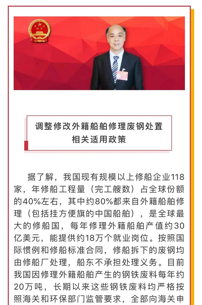 船舶看兩會|全國人大代表馬加友:修船廢鋼政策調整勢在必行!