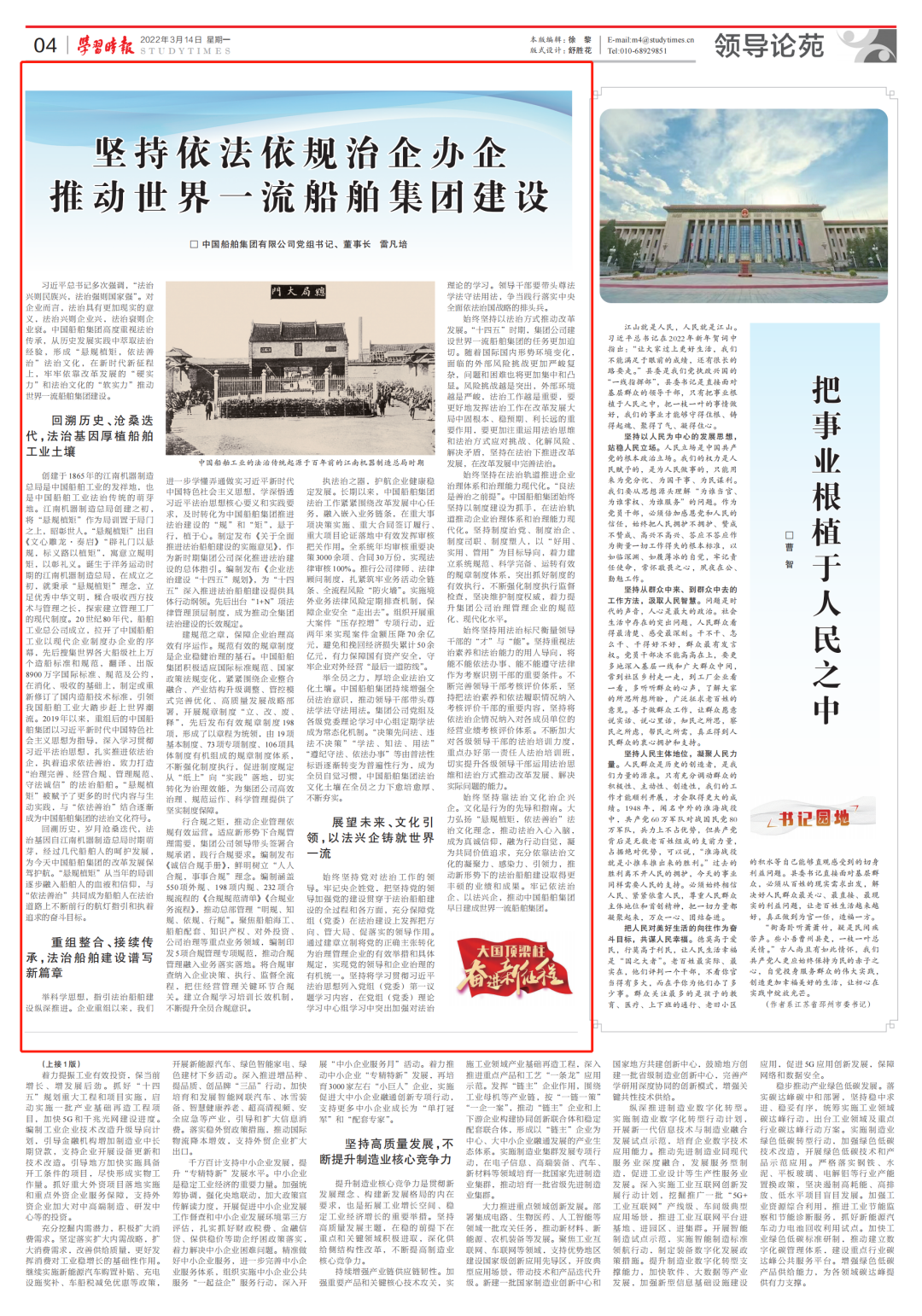 3月14日,《學(xué)習(xí)時(shí)報(bào)》刊發(fā)中國(guó)船舶集團(tuán)有限公司黨組書(shū)記、董事長(zhǎng)雷凡培的署名文章《堅(jiān)持依法依規(guī)治企辦企 推動(dòng)世界一流船舶集團(tuán)建設(shè)》,全文如下: