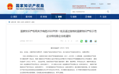 10月31日,國家知識產權局發布了《關于確定2022年新一批及通過復核的國家知識產權示范企業和優勢企業的通知》(國知發運函字〔2022〕160號)。