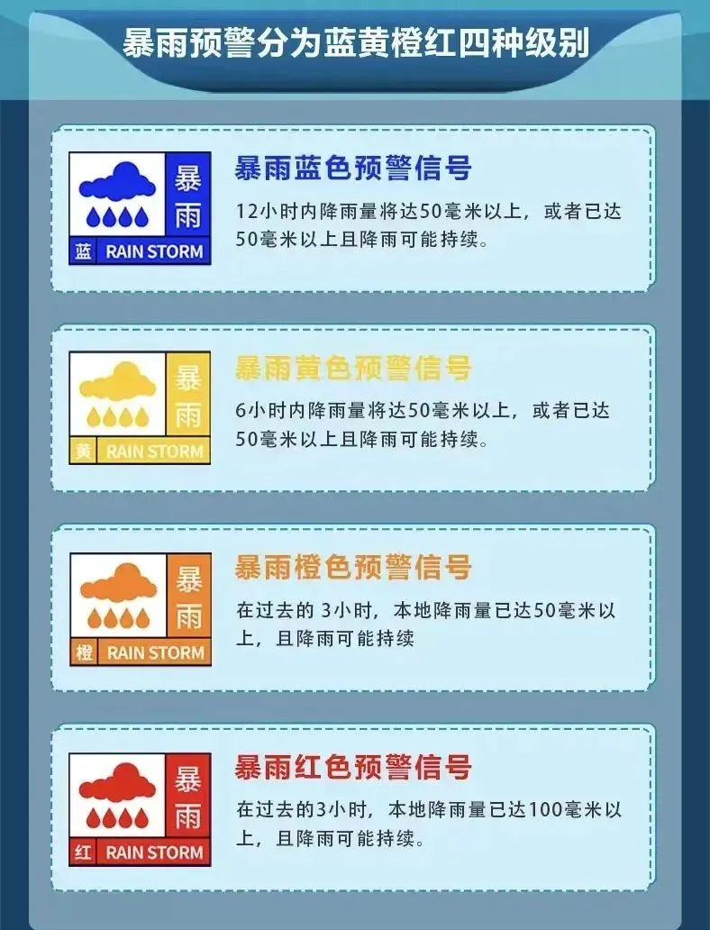 暴雨預警信號是氣象部門通過氣象監測,在暴雨到來之前做出的預警信號,暴雨預警信號分四級,分別以藍色、黃色、橙色、紅色表示。
