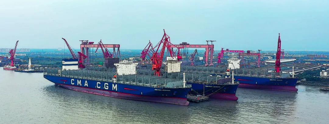 “海上綠巨人”系列箱船是滬東中華近期的重點產品。三艘15000TEU集裝箱船列隊整齊,滬東中華建造團隊開足馬力,奮戰金秋。該型號集裝箱船是當今世界綠色環保船型,國產化率達到90%,可靈活布置于全球各個重要航線。