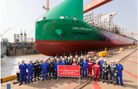 5月15日,中國船舶集團旗下滬東中華為法國達飛集團建造的13000TEU雙燃料集裝箱船首制船(H1839A)在順利出塢。該項目共6艘13000TEU雙燃料集裝箱船,目前首制船出塢,2號3號船塢內建造,4號船燃料艙即將入塢,5號船處于分段制造階段,6號船于5月4日完成開工。